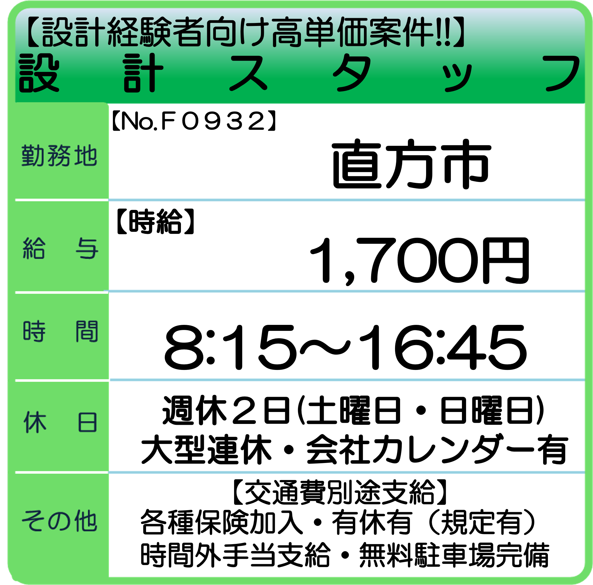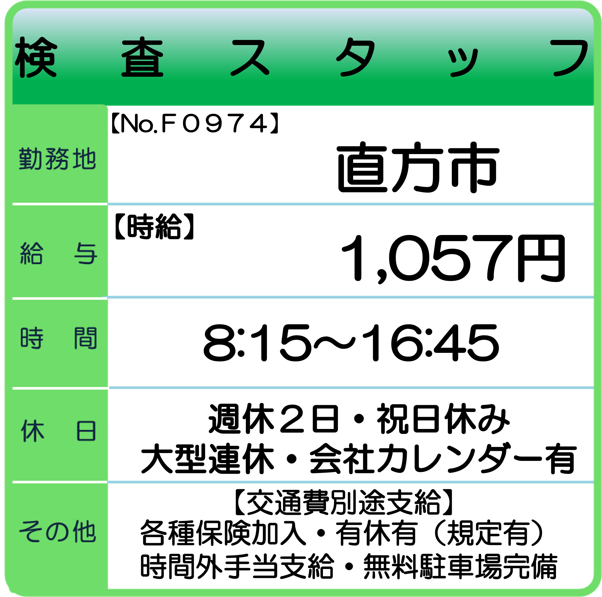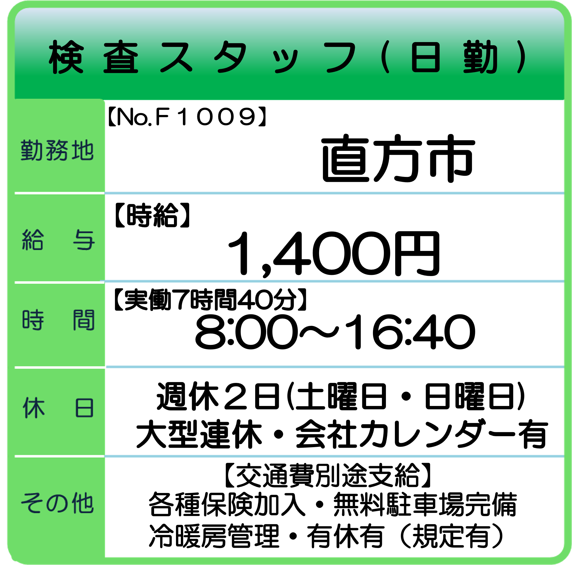 直方市 求人情報 【お仕事No.1009】 検査スタッフ(日勤) 【お仕事No.1001】 工場事務 【お仕事No.0990】 研究補助業務 【お仕事No.0976】 金属加工会社での組立業務 【お仕事No.0975】 金属のメッキ処理業務 【お仕事No.0974】 検査スタッフ(週3日の扶養内でのお仕事) 【お仕事No.0963】 家電部品の組み立て作業 【お仕事No.0954】 機械での穴あけ作業 【お仕事No.0953】 樹脂製品の原料製造(4勤2休) 【お仕事No.0939】 包装スタッフ 【お仕事No.0932】 設計スタッフ 【お仕事No.0923】 【未経験者大歓迎!!】 加工オペレーター 【お仕事No.0914】 F0914 【体への負担微少】 板を機械へ投入する作業 一覧へ戻る 福岡支社求人情報へのお問合せ