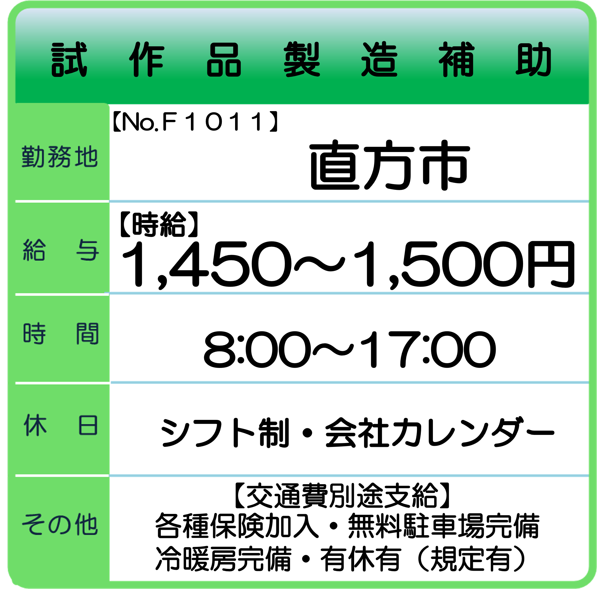 直方市 求人情報 【お仕事No.1011】 試作品製造補助 【お仕事No.1009】 検査スタッフ(日勤) 【お仕事No.1001】 工場事務 【お仕事No.0990】 研究補助業務 【お仕事No.0976】 金属加工会社での組立業務 【お仕事No.0975】 金属のメッキ処理業務 【お仕事No.0974】 検査スタッフ(週3日の扶養内でのお仕事) 【お仕事No.0954】 機械での穴あけ作業 【お仕事No.0953】 樹脂製品の原料製造(4勤2休) 【お仕事No.0939】 包装スタッフ 【お仕事No.0932】 設計スタッフ 【お仕事No.0923】 【未経験者大歓迎!!】 加工オペレーター 【お仕事No.0914】 F0914 【体への負担微少】 板を機械へ投入する作業 一覧へ戻る 福岡支社求人情報へのお問合せ