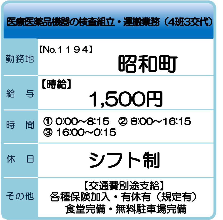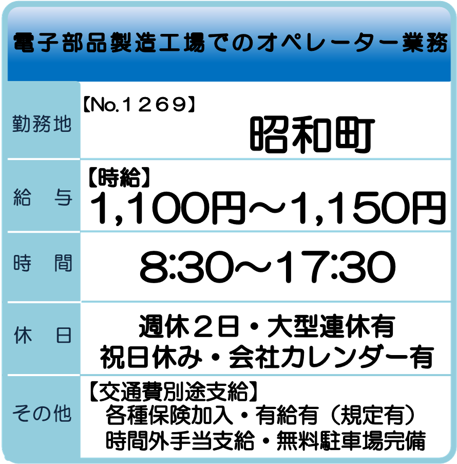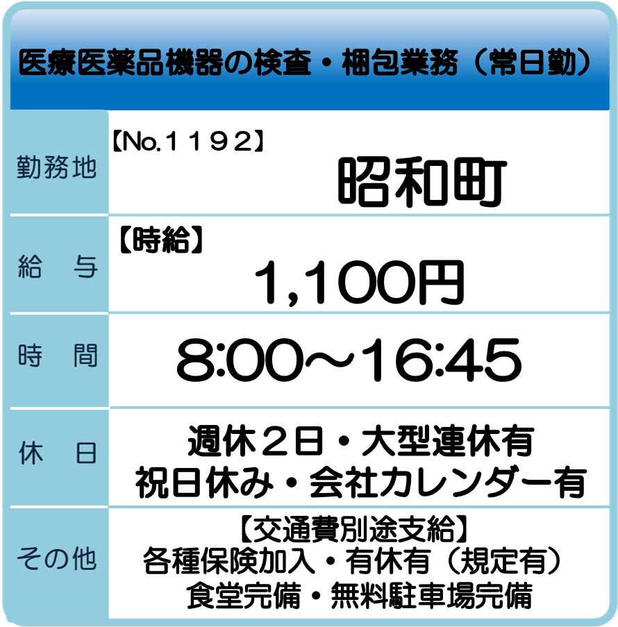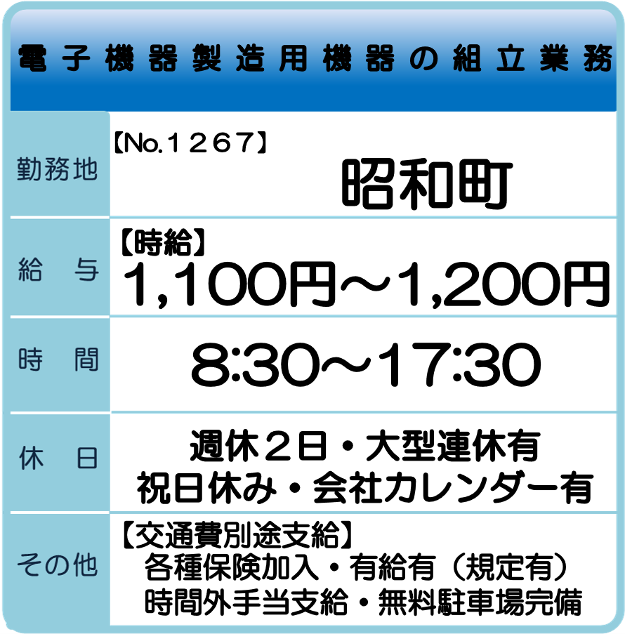 昭和町 求人情報 【お仕事No.1314】 ケーブル部品の組立業務 【お仕事No.1300】 半導体製造用機器の組み立て業務 【お仕事No.1298】 海外向け外装箱の梱包業務 【お仕事No.1297】 出荷用外装箱の製函業務 【お仕事No.1269】 電子部品製造工場でのオペレーター業務 【お仕事No.1268】 電子部品製造工場での検査業務 【お仕事No.1267】 電子機器製造用機器の組立業務 【お仕事No.1266】 電子機器製造用機器の材料ピッキング業務 【お仕事No.1194】 医療医薬機器の検査組立・運搬業務(4班3交替) 【お仕事No.1193】 医療医薬機器の検査・包装業務(4班3交替) 【お仕事No.1192】 医療医薬機器の検査・包装業務(常日勤) 一覧へ戻る 山梨支社求人情報へのお問合せ
