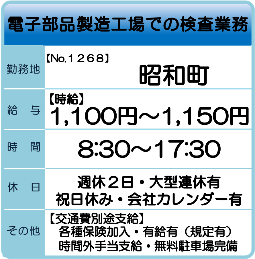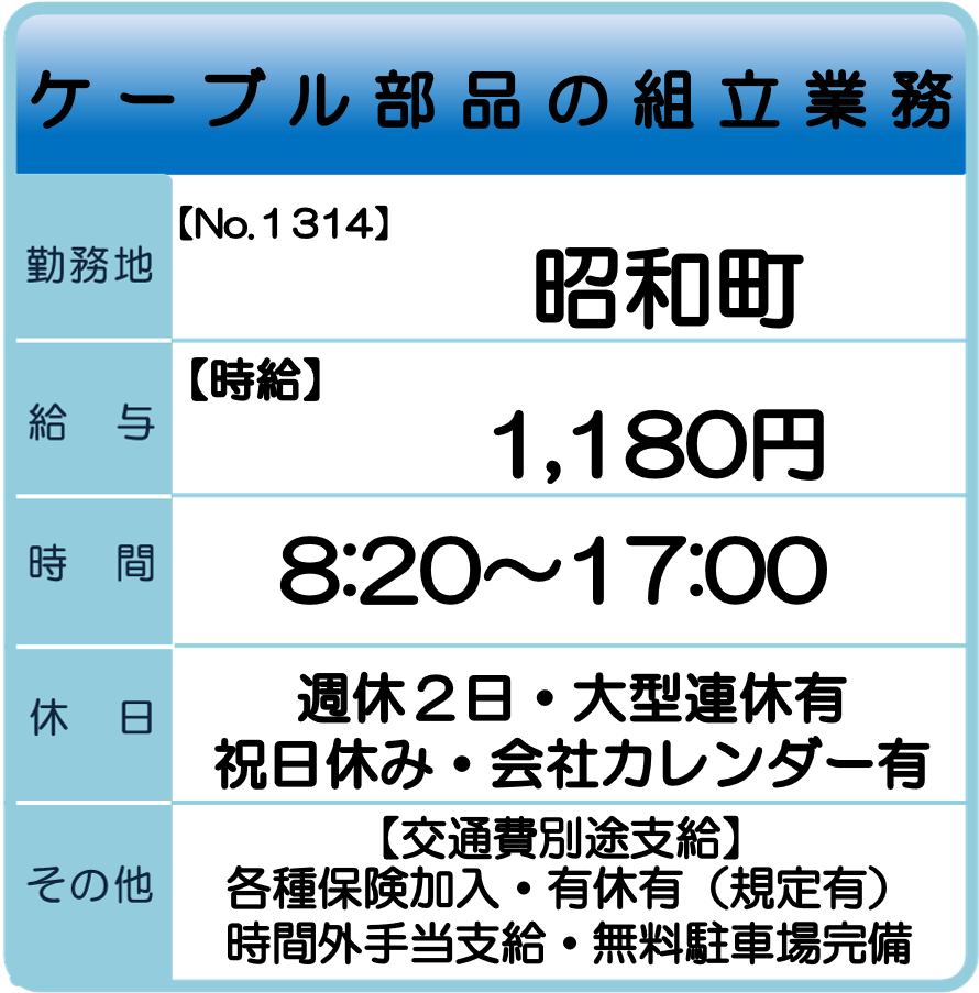 昭和町 求人情報 【お仕事No.1314】 ケーブル部品の組立業務 【お仕事No.1300】 半導体製造用機器の組み立て業務 【お仕事No.1298】 海外向け外装箱の梱包業務 【お仕事No.1297】 出荷用外装箱の製函業務 【お仕事No.1287】 お菓子の梱包・シール貼り作業 【お仕事No.1269】 電子部品製造工場でのオペレーター業務 【お仕事No.1268】 電子部品製造工場での検査業務 【お仕事No.1267】 電子機器製造用機器の組立業務 【お仕事No.1266】 電子機器製造用機器の材料ピッキング業務 【お仕事No.1257】 重量物移動用器具の組立業務 【お仕事No.1194】 医療医薬機器の検査・包装業務(4班3交替) 【お仕事No.1193】 医療医薬機器の検査・包装業務(4班3交替) 【お仕事No.1192】 医療医薬機器の検査・包装業務(常日勤) 一覧へ戻る 山梨支社求人情報へのお問合せ